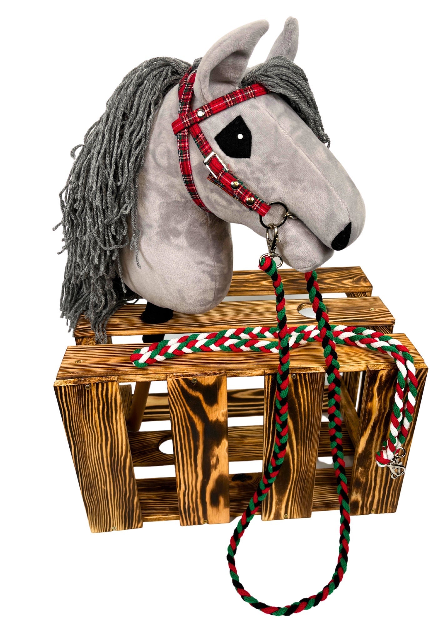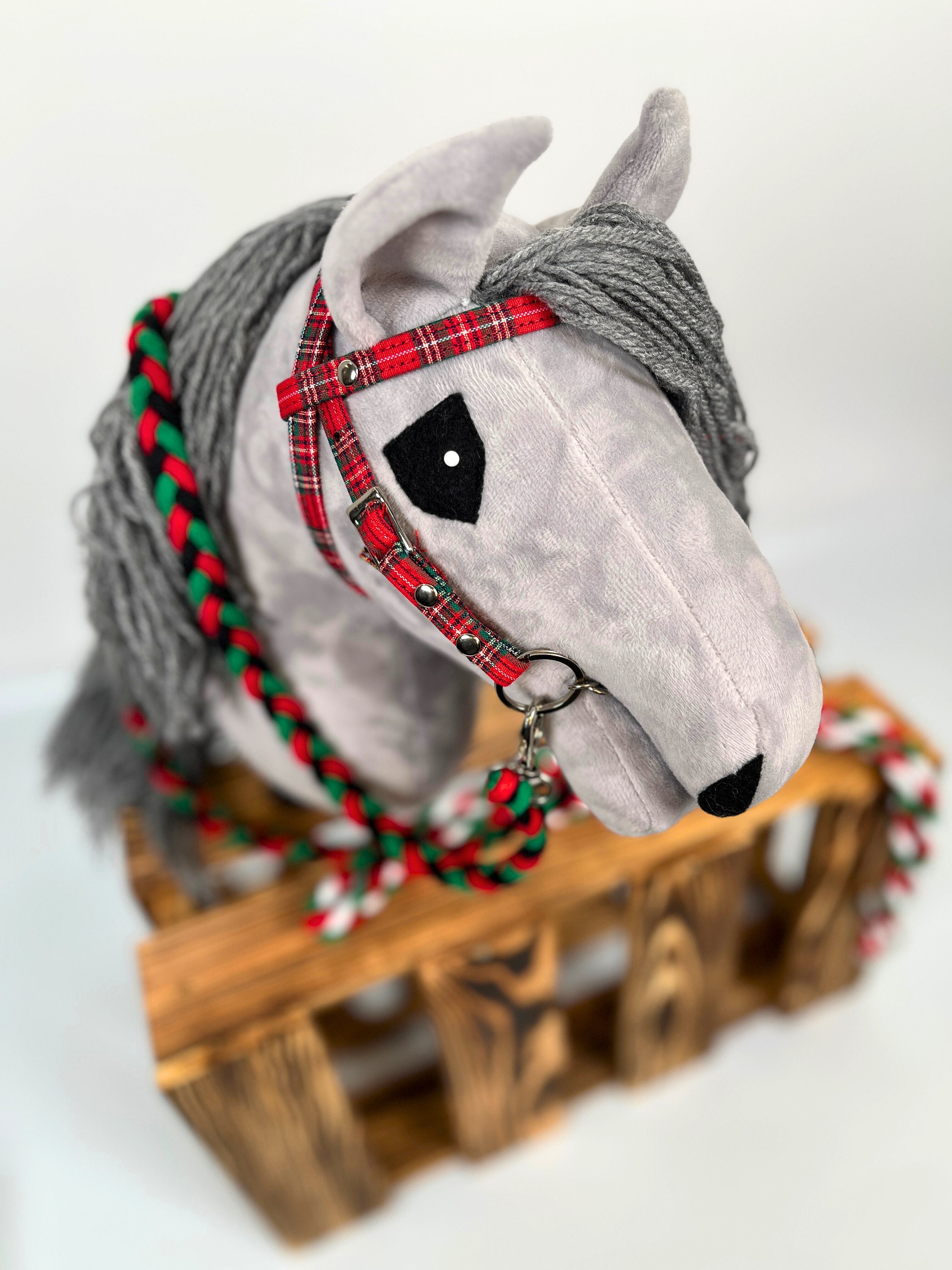 The bridle is made of synthetic leather with a checkered pattern, making it suitable for your hobby horse all year round. Although the pattern is associated with Christmas, it's versatile.