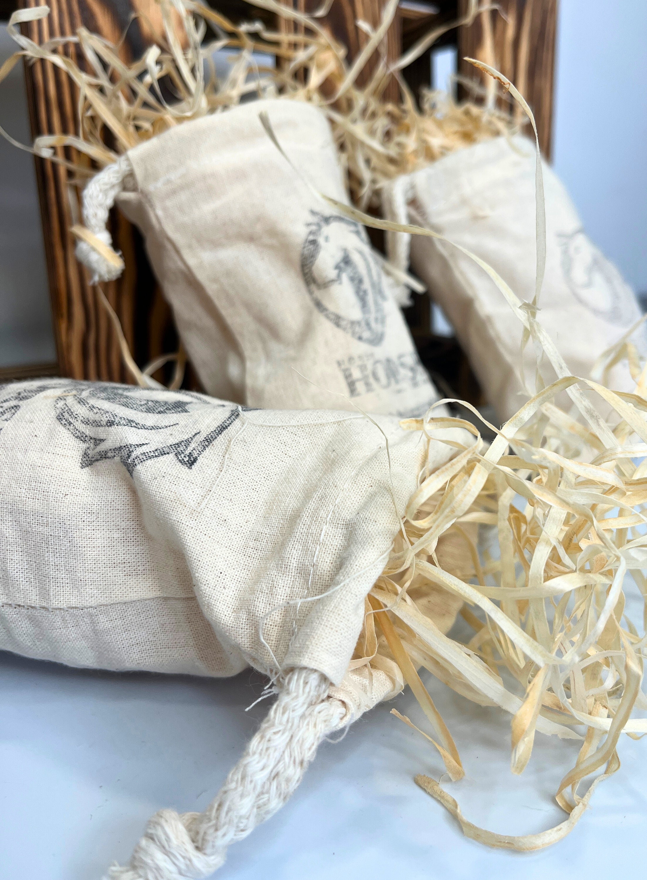 We offer hay for hobby horses, packed in a small jute bag measuring 14 cm x 9 cm. Hay is an excellent treat for the horse and can also play a decorative role in the stable. The price is for 1 bag of hay ( bag plus hay ), this offers does NOT include a rustically stable.