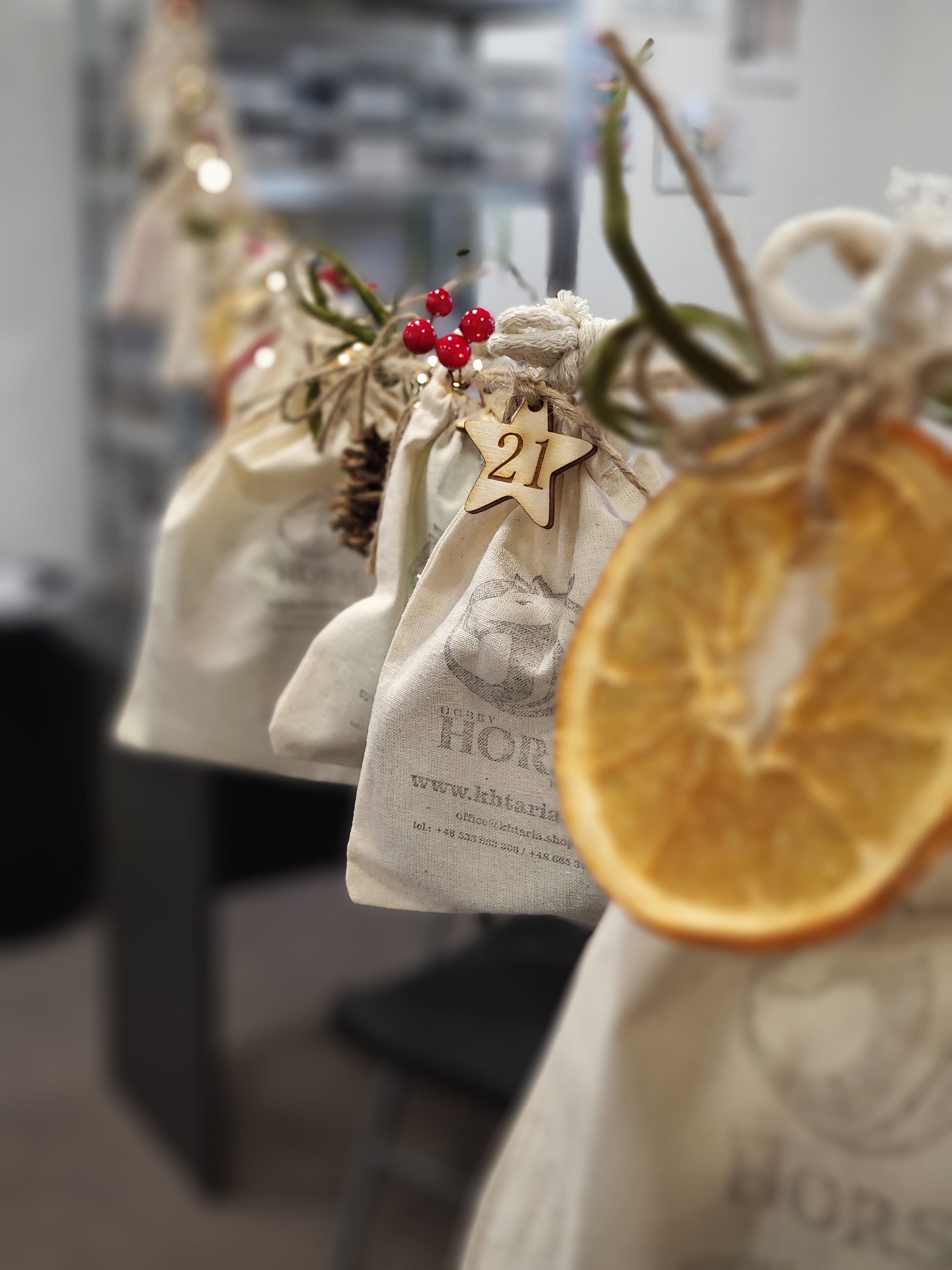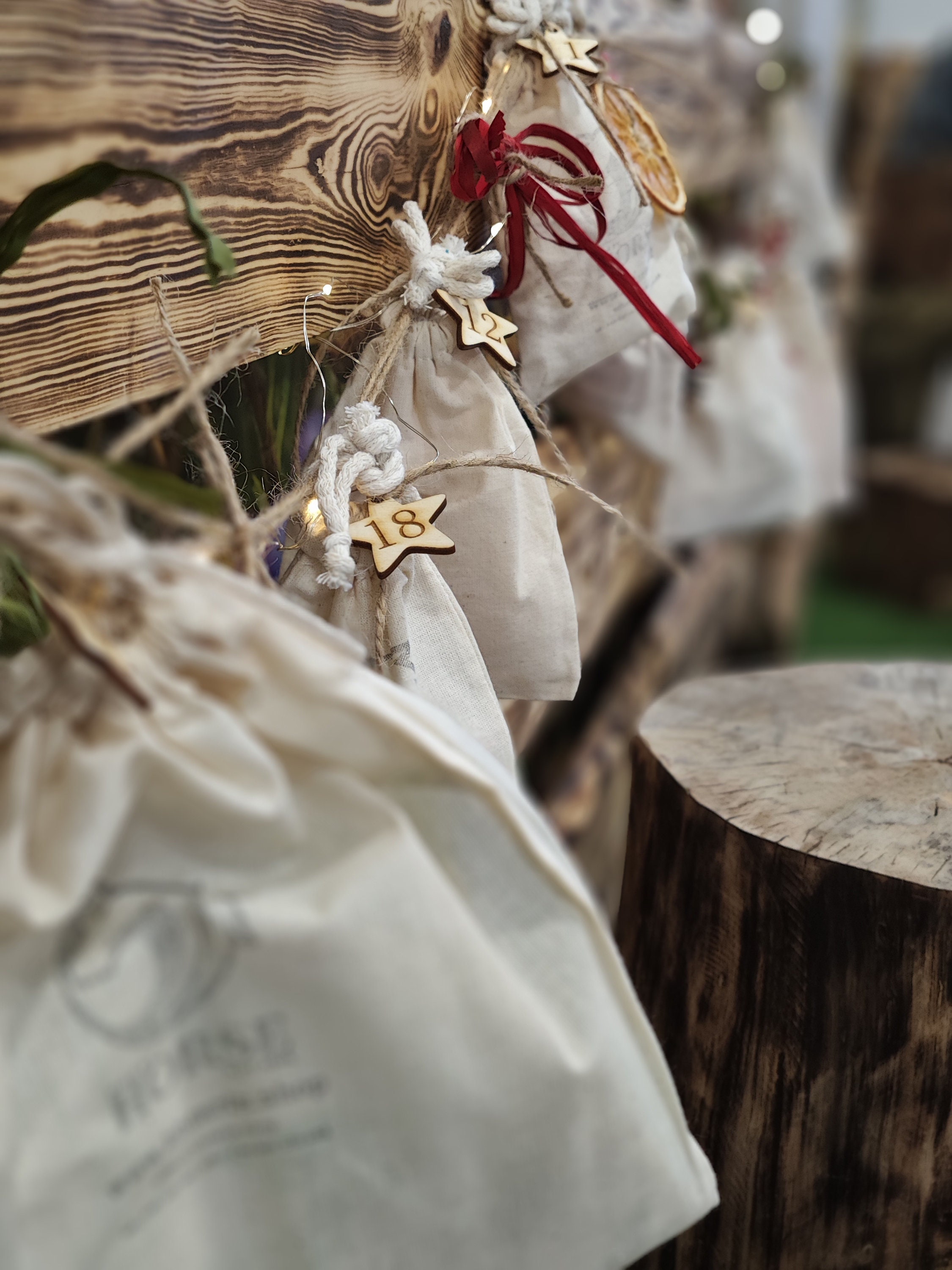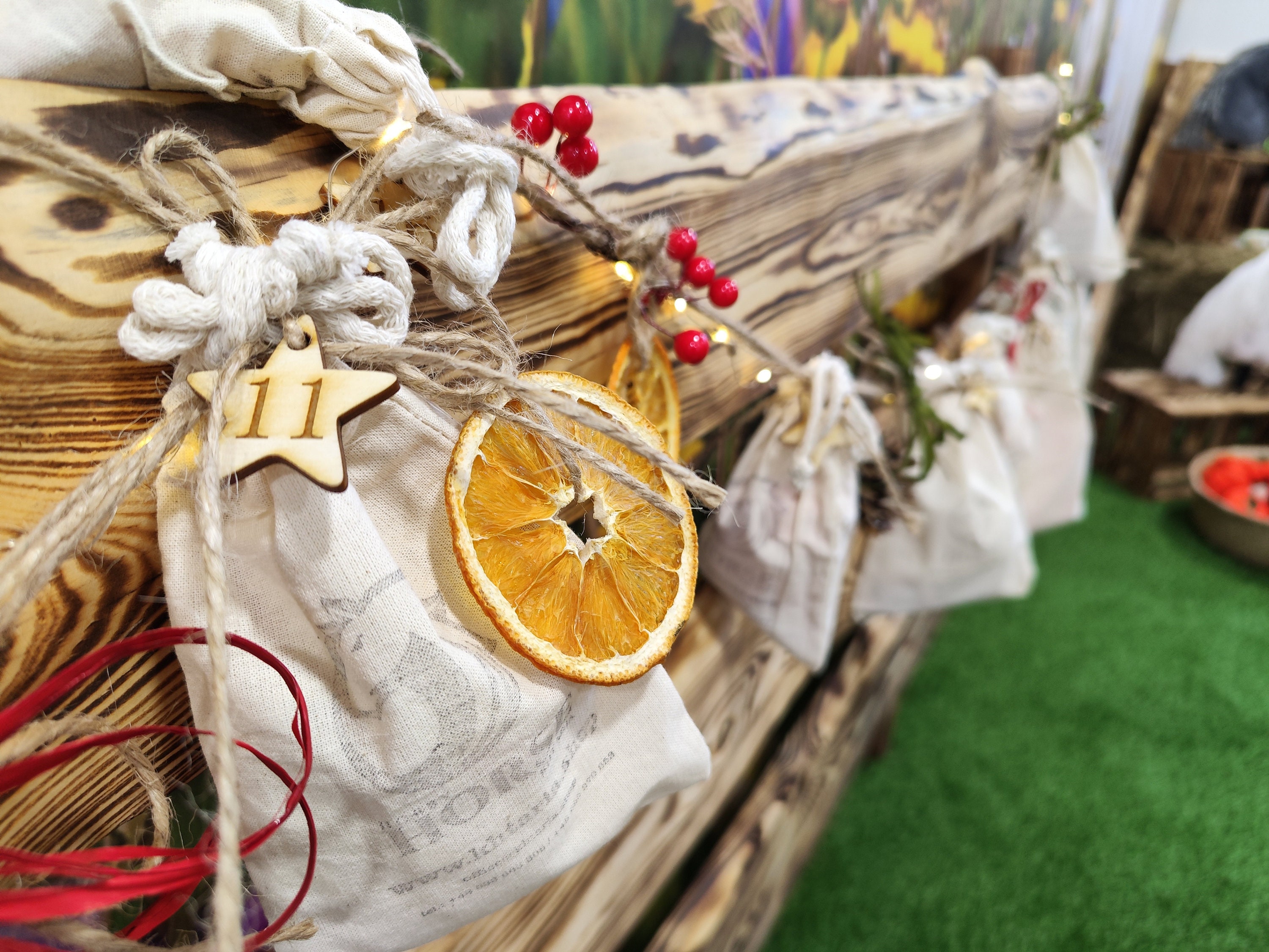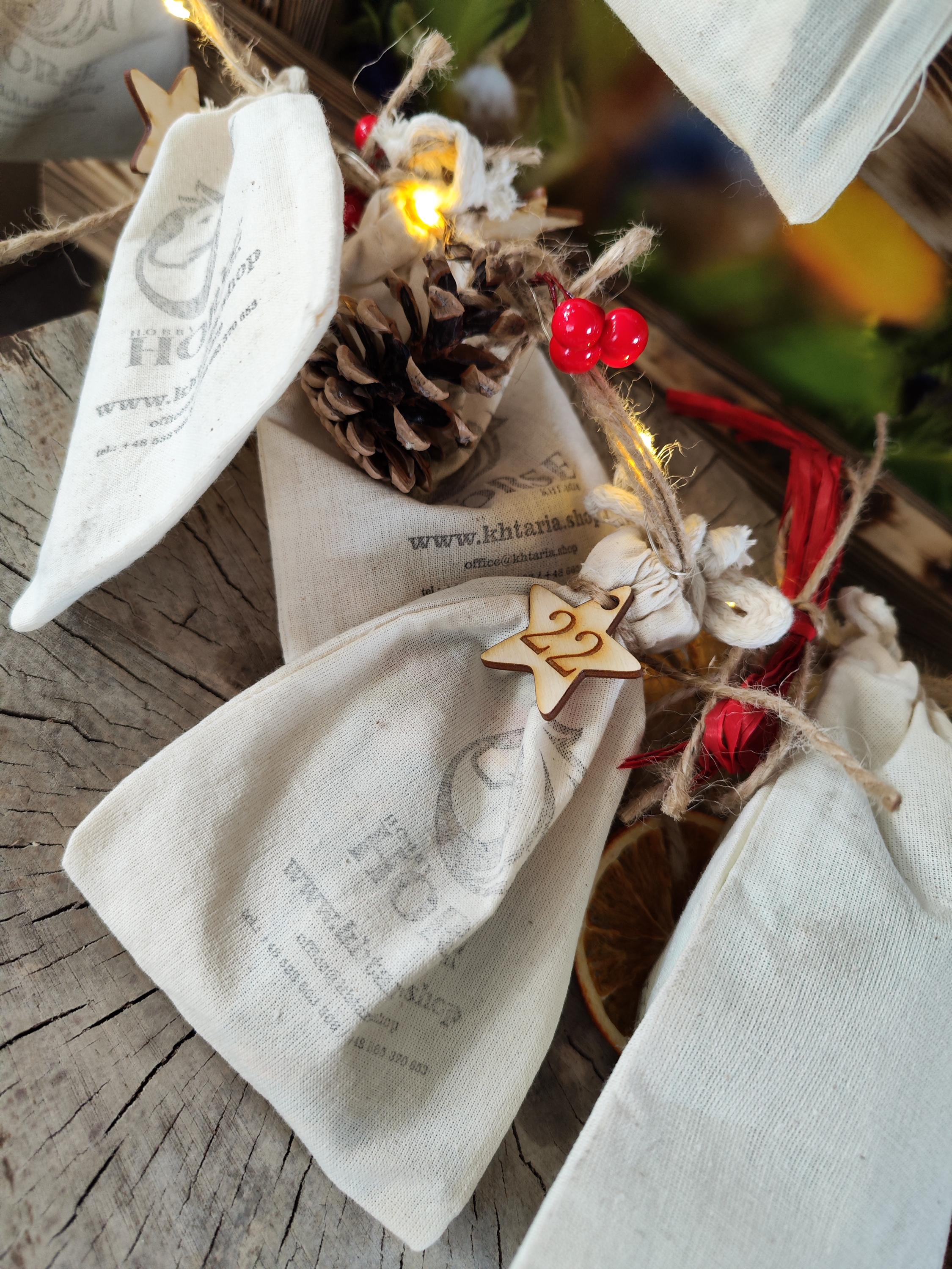 The calendar consists of **12 or 24** numbered jute bags 🎁 (depending on your choice – the basic version is a **12-window calendar without a horse** 🐎) hung on a stylish string 🧵, all decorated in a festive style 🎅. The calendar can be hung in a child’s room in various ways – attach it to a wall, curtain, or even string it across the room 🎀.